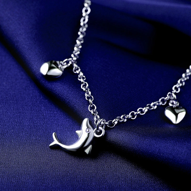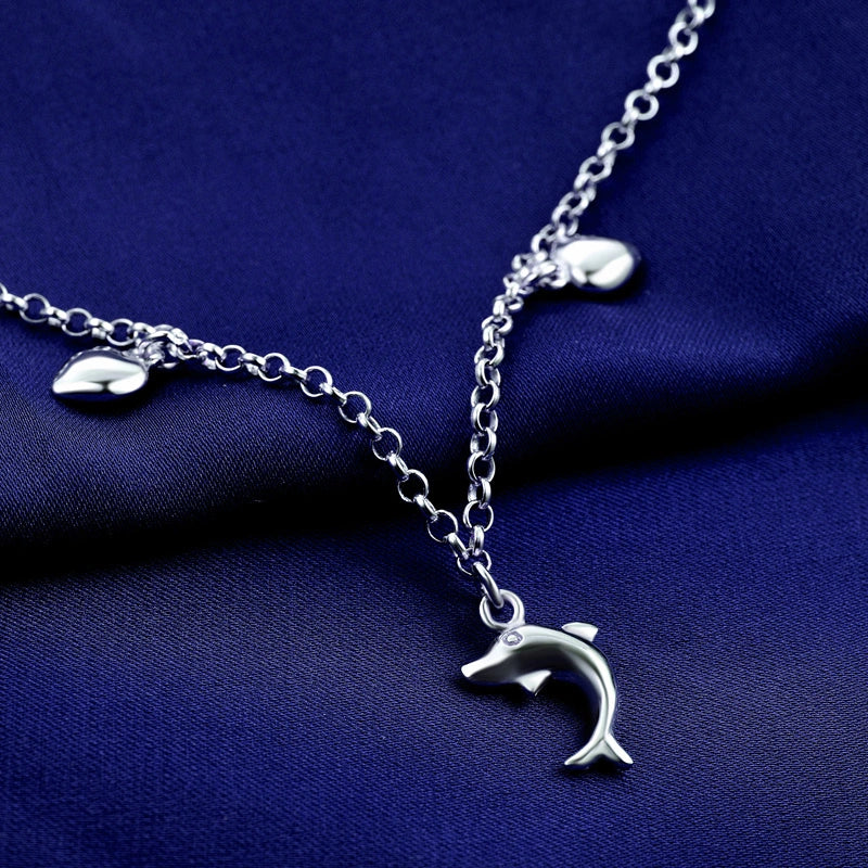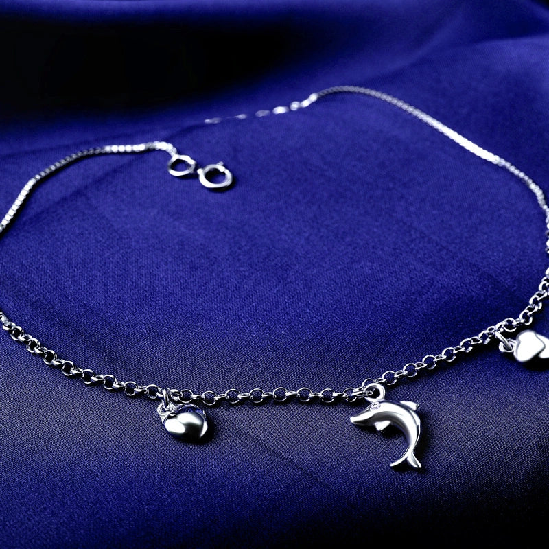 Letโs talk luckโthis ainโt your basic bling! Weโre bringing the oceanโs magic to your ankle with aย sterling silverย anklet packed with twoย heart charmsย and oneย dolphin charmย spaced between shiny beads. Hereโs why this 24cm beauty (with a 3cm adjustable chain) is the ultimate good vibe accessory: